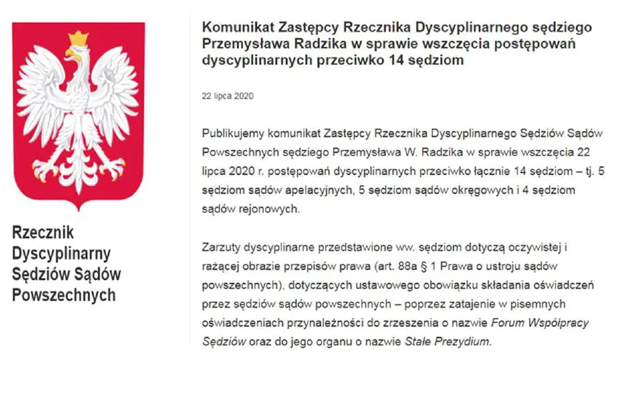 Komunikat Zastępcy Rzecznika Dyscyplinarnego sędziego Przemysława Radzika w sprawie wszczęcia postępowań dyscyplinarnych przeciwko 14 członkom Stałego Prezydium Forum Współpracy Sędziów