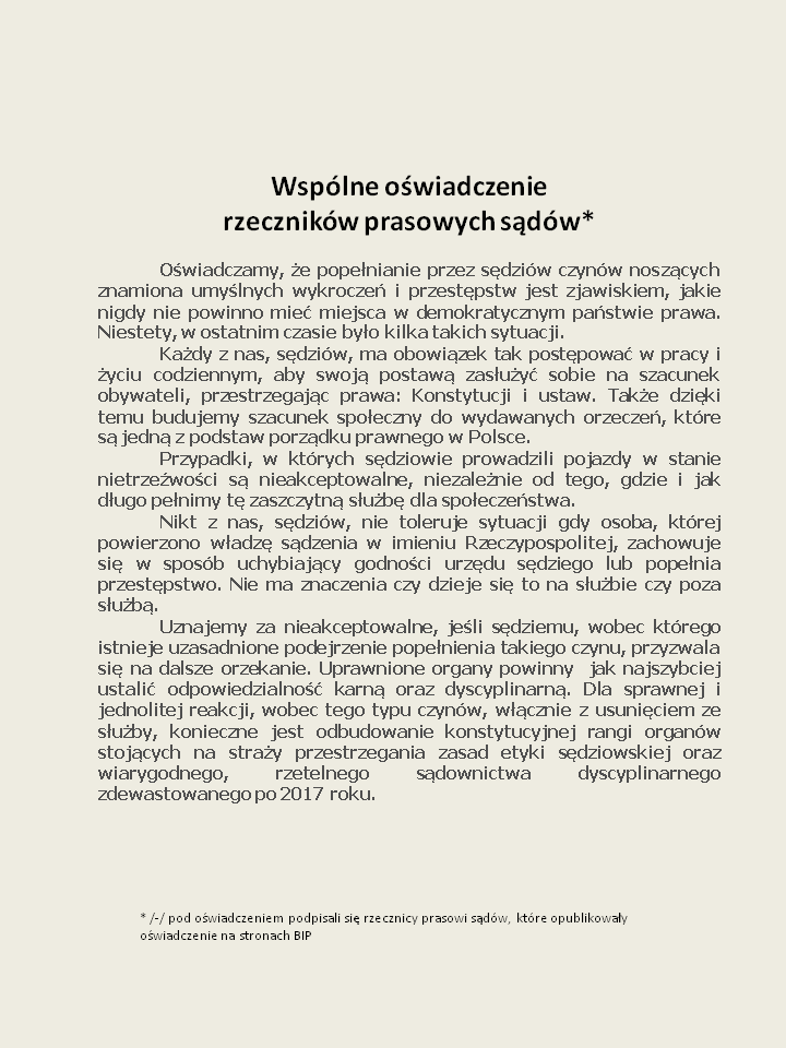 W reakcji na kilka sytuacji, w których sędziowie dopuścili się czynów wyczerpujących znamiona przestępstwa określonego w art. 178 a § 1 kodeksu karnego (prowadzenie pojazdu mechanicznego znajdując się w stanie nietrzeźwości) rzecznicy prasowi sądów wydali poniższe oświadczenie: