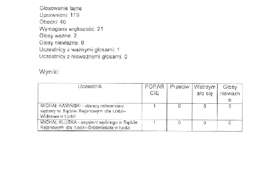 Po środowym zgromadzeniu zakończonym wydaniem przez jednego przedstawiciela 1-osobowej opinii o kandydatach na wolne stanowiska sędziowskie na Śródmieściu, Widzewie i w Zgierzu, w okręgu łódzkim zawrzało. Skoro Zgromadzenie, jako kolegialny organ samorządu, bezwzględną większością głosów zdecydowało o odroczeniu opiniowania, owa indywidualna opinia winna być podpisana imieniem i nazwiskiem sędziego, który głosował. Niestety w protokole tej ważnej informacji o personaliach opiniującego nie podano. Zagadka, który z sędziów zastąpił jednoosobowo cały samorząd okręgu łódzkiego, po zebraniu faktów i sprostowaniu nieścisłości, które wkradły się do mojej relacji ze środy nie jest jednak nie do rozwiązania. Przypomnijmy, po zakończeniu głosowania nad uchwałą o odroczeniu, na sali obrad pozostali: prezes, wiceprezes, protokolant i dwoje sędziów. Według mojego błędnego stanu wiedzy sprzed trzech dni, ani prezes ani wiceprezes nie byli uprawnieni do głosowania nie są bowiem przedstawicielami. Stwierdzenie to jest jednak tylko w połowie prawdziwe. Prezes Michał Błoński rzeczywiście nie jest przedstawicielem, ale wiceprezes Marek Kruszewski już tak. Na sali pozostała jeszcze protokolantka oraz dwójka sędziów. Wszyscy troje twierdzą, że nie brali udziału w głosowaniu nad kandydatami, które zarządził prezes po odroczeniu głosowania przez Zgromadzenie. Protokolant pozostał na sali z racji obowiązku protokołowania, a pozostała dwójka, jak oświadczyli, jako obserwatorzy. Głosowanie nad odroczeniem opiniowania było tajne, nie będę więc dociekać kto głosował przeciwko odroczeniu. Jednak głos przeciw to niekoniecznie wola opiniowania na siłę wbrew decyzji większości. Na zgromadzeniu apelacyjnym w grudniu głosów przeciw odroczeniu było 27, a nie opiniował nikt, bo demokracja polega na ścieraniu się poglądów i uznawaniu wyniku głosowania za wiążący. Wbrew opinii prezesa Błońskiego dwa głosy oddane przeciwko odroczeniu nie oznaczały “Chcemy opiniować kandydatów” tylko “Chcemy, żeby Zgromadzenie zaopiniowało kandydatów”. W mojej ocenie to znacząca różnica. Dlatego nie dziwi mnie, że jeden sędzia, który zagłosował przeciwko odroczeniu w dalszych czynnościach zarządzonych przez prezesa już nie uczestniczył. Dziwi mnie natomiast zachowanie tego drugiego, który uznał się za kompetentnego do odegrania roli całego zgromadzenia. Do tego wszyscy oceniani dostali równo 1 głos za. Takiej zgodności opinii środowiska nigdy wcześniej nie było! Tylko czego z tej opinii o lokalnym poparciu dla kandydatów dowie się KRS? To oczywiście jednak już nie nasz kłopot.