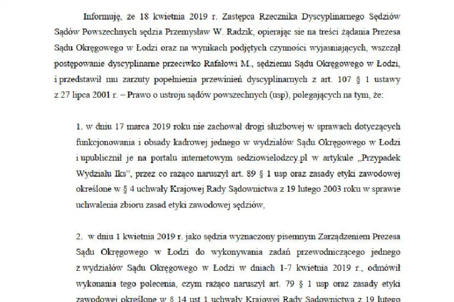Informuję, że 18 kwietnia 2019 r. Zastępca Rzecznika Dyscyplinarnego Sędziów Sądów Powszechnych sędzia Przemysław W. Radzik, opierając się na treści żądania Prezesa Sądu Okręgowego w Łodzi oraz na wynikach podjętych czynności wyjaśniających, wszczął postępowanie dyscyplinarne przeciwko Rafałowi M., sędziemu Sądu Okręgowego w Łodzi, i przedstawił mu zarzuty popełnienia przewinień dyscyplinarnych z art. 107 § 1 ustawy z 27 lipca 2001 r. – Prawo o ustroju sądów powszechnych (usp), polegających na tym, że: