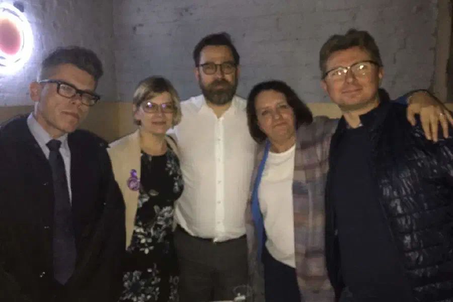 Po zakończeniu oficjalnego spotkania udało się nam wygospodarować trochę czasu, aby już w kameralnym gronie samych sędziów (na zdjęciu od lewej: Igor Tuleya, Ewa Maciejewska, Bartłomiej Przymusiński, Katarzyna Wesołowska-Zbudniewek i Tomasz Krawczyk) porozmawiać o nastrojach i działaniach środowiska w Warszawie, Poznaniu i Łodzi. Pewnym plusem obecnym smutnych czasów jest to, że poznaje się wspaniałych ludzi i bardzo szybko nawiązuje się z nimi bliskie, przyjacielskie relacje.