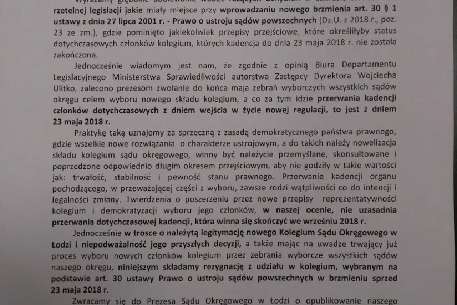W przypadku obejmowania stanowisk po odwołanych prezesach oraz wyboru nowej sędziowskiej części KRS, stanowisko łódzkiego samorządu sędziowskiego było jednoznaczne – udział w tych procedurach uznaliśmy za sprzeczny z etyką sędziowską i złożonym przyrzeczeniem stania na straży prawa, w szczególności co do odrębności władzy sądowniczej od pozostałych władz (vide: uchwała nr 1 Zebrania Sędziów Sądu Okręgowego w Łodzi z dnia 15 stycznia 2018 r. oraz nr 2 z dnia 26 stycznia 2018 r., a także uchwały Zgromadzenia Przedstawicieli Sędziów okręgu Sądu Okręgowego w Łodzi: nr 2 z dnia 26 lutego 2018 r. i nr 2 z dnia 29 marca 2018 r.). Zarówno przy wyborze prezesa jak i sędziów do KRS, decyzja nie mogła być inna – jako samorząd - zostaliśmy bowiem całkowicie pozbawieni wpływu na te organy, co stanowi oczywiste naruszenie równowagi władz.
