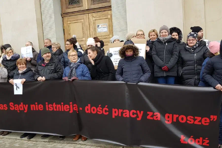 Protest pracowników trwa, a nawet rozwija się i modernizuje. Od czwartku „przerwa śniadaniowa” przeniosła się na ulicę Narutowicza oraz pojawił się nowy profesjonalnie wykonany banner. Na czarnym tle czerwone litery: „”Bez Nas Sądy nie istnieją – dość pracy za grosze” Łódź.