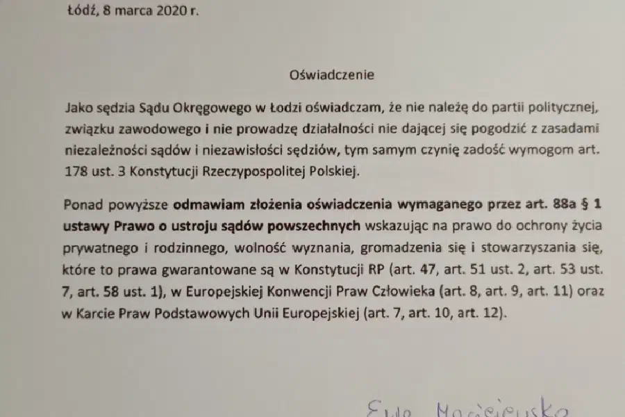 Ponad powyższe odmawiam złożenia oświadczenia wymaganego przez art. 88a § 1 ustawy Prawo o ustroju sądów powszechnych wskazując na prawo do ochrony życia prywatnego i rodzinnego, wolność wyznania, gromadzenia się i stowarzyszania się, które to prawa gwarantowane są w Konstytucji RP (art. 47, art. 51 ust. 2, art. 53 ust. 7, art. 58 ust. 1), w Europejskiej Konwencji Praw Człowieka (art. 8, art. 9, art. 11) oraz w Karcie Praw Podstawowych Unii Europejskiej (art. 7, art. 10, art. 12).