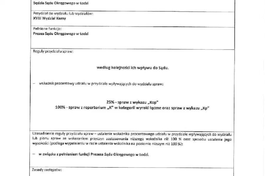 Gdy został Prezesem SO, w dniu 20 marca 2018 r. określił sobie podział obowiązków obowiązujący od dnia 19 marca 2018 r. do dnia 31 grudnia 2018 r. Nie wzbudzał on zastrzeżeń: miał wpisane w rubrykę „Reguły przydziału spraw”: „według kolejności ich wpływu do sądu”, a jako „wskaźnik procentowy udziału w przydziale wpływających do wydziału spraw”: 25 %. Wprawdzie było to minimum przewidziane przez u.s.p., ale tak określony podział mieścił się w przepisach. Zapis był jasny, w każdej z kategorii spraw w zakładce sędziego M. Błońskiego winien się znaleźć jednolity parametr: „0,25”.