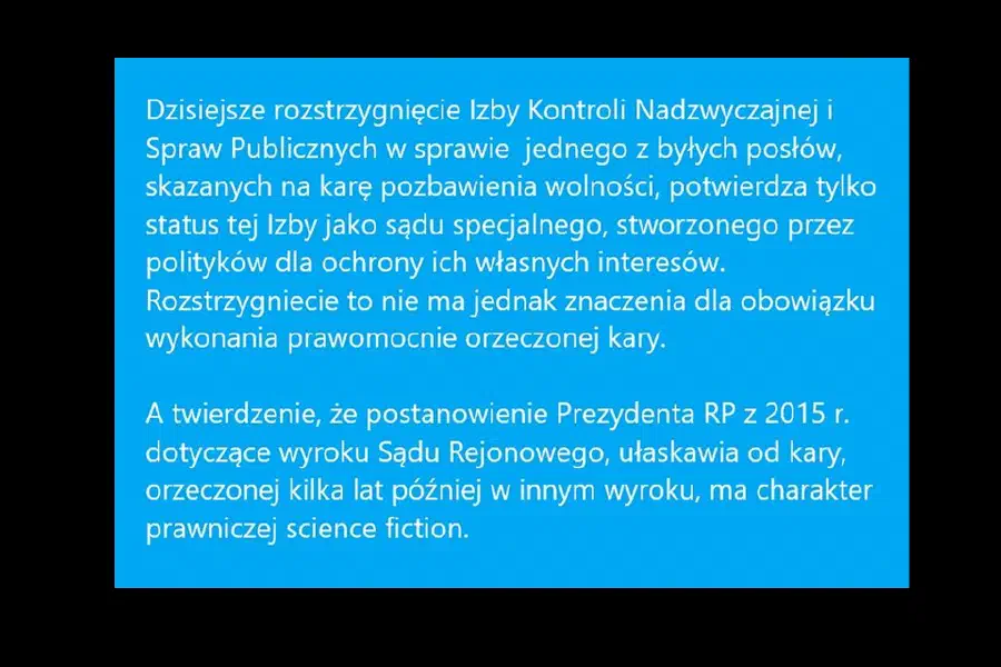 Dzisiejsze rozstrzygnięcie Izby Kontroli Nadzwyczajnej i Spraw Publicznych w sprawie jednego z byłych posłów, skazanych na karę pozbawienia wolności, potwierdza tylko status tej Izby jako sądu specjalnego stworzonego przez polityków dla ochrony ich własnych interesów. Rozstrzygniecie to nie ma jednak znaczenia dla obowiązku wykonania prawomocnie orzeczonej kary.